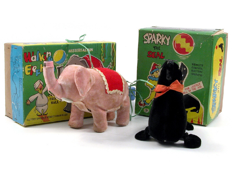 longueur 18 cm - en action, l'otarie avance en se dandinant & souffle de l'air pour jouer avec un ballon - tous les mécanismes fonctionnent - avec cale de boîte & 2 ballons (déformés)