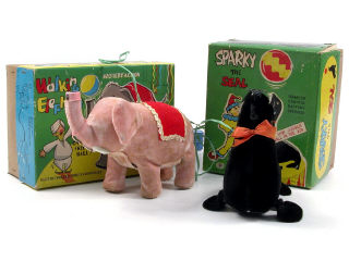 longueur 21 cm - moteur à piles (fonctionne) - télécommande présente - en action, l'éléphant avance tandis qu'il souffle sur un ballon avec sa trompe - avec cale de boîte & sachet de 2 ballons (déformés) - languette de maintien de ballon déssoudée - quelques traces de salissures sur le pelage
