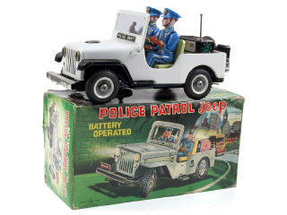 longueur 27,5 cm - en action, la voiture avance en zigzaguant & en évitant les obstacles tandis que le conducteur tourne le volant - lorsque la voiture stoppe une sonnerie retentit & le passager porte le combiné téléphonique à son oreille - mécanismes fonctionnent - éclairage du poste de radio à revoir - une petite trace d'oxydation sur la base de l'aile arrière gauche