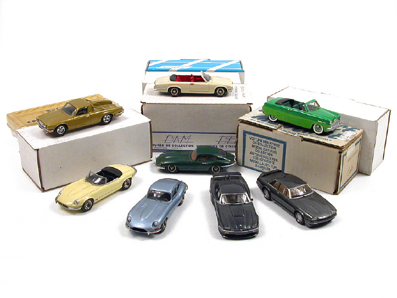 miniatures reproduisant les modèles : JAGUAR & FORD - on y retrouve les marques : MRF, ALEZAN, PROVENCE MOULAGE, DAM, TENARIV & AUTOMANY - petits manques - une boîte en état 'c' & une autre non d'origine