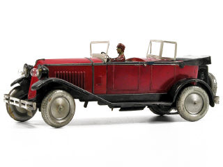 longueur 39 cm - fabrication de 1934 sans logo RENAULT sur la calandre - moteur à ressort (fonctionne) - avec chauffeur, phares électriques (à revoir), parties ouvrantes, pare-chocs à double-lames & direction - manque vitres de pare-brise avant & arrière - parties restaurées & repeintes - ampoules non d'origine - une fixation de capote cassée - manque plaque minéralogique arrière - petites traces d'oxydation - TRES BEL ASPECT GENERAL !