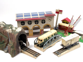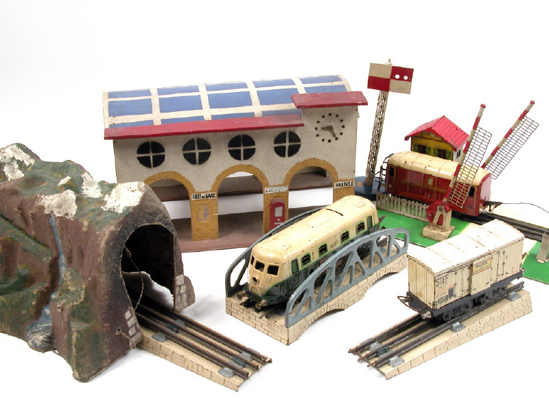 états de 'C' à 'D' - comprend : une motrice électrique, un fourgon postal, un wagon-fourgon 'STEF', une gare en bois, un tunnel en carton bouilli, un passage à niveau électrique, un signal de voie & un pont suspendu - traces d'oxydation - petits manques - on y retrouve notamment les marques JEP & HORNBY