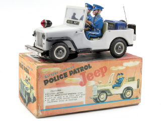 longueur 27,5 cm - en action, la voiture avance en zigzaguant & en évitant les obstacles tandis que le conducteur tourne le volant - lorsque la voiture stoppe une sonnerie retentit & le passager porte le combiné téléphonique à son oreille - avec phare de capot lumineux (fêlé) - mécanismes fonctionnent - manque extrémité d'interrupteur - vis de fixation de trappe non d'origine - avec boîte fac-similé