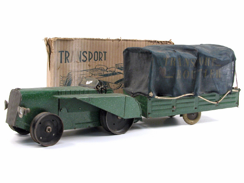 longueur 68 cm - modèle produit en 1935-36 - moteur à clef (à revoir) - équipé de phares électriques (une ampoule à revoir) - la bâche est en toile bleue - manque chenilles - traces d'oxydation