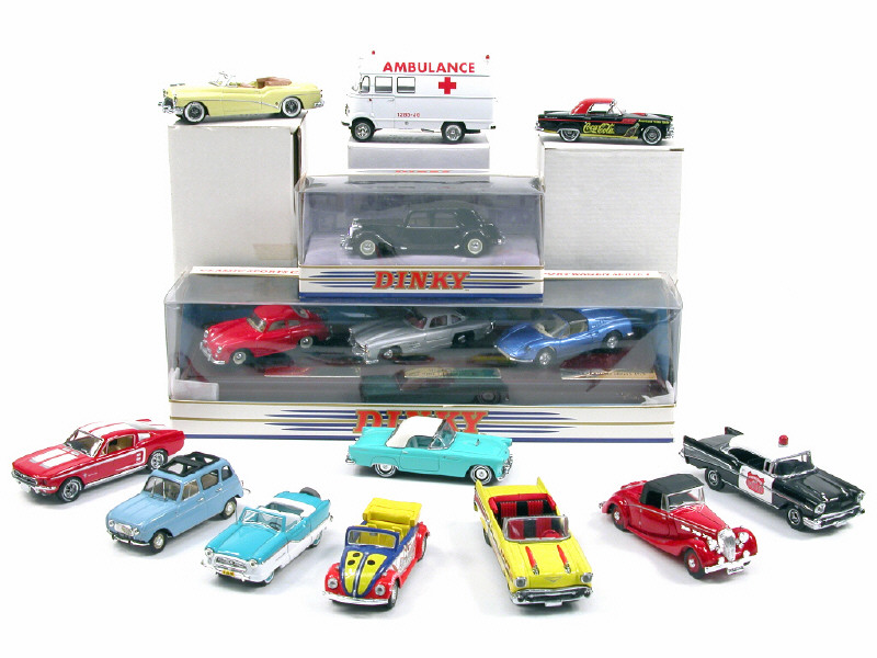 comprend : FORD MUSTANG FASTBACK, TRIUMPH DOLOMITE, RENAULT 4L, FORD THUNDERBIRD, CHEVROLET BELAIR cabriolet 'COCA COLA', CHEVROLET BELAIR 'ATLANTA POLICE', VOLKSWAGEN COCCINELLE 'BUDWISER', FORD THUNDERBIRD 'COCA COLA', NASH METROPOLITAN, BUICK SKYLARK cabriolet, CITROËN 15 CV, PORSCHE 366A coupé, MERCDEDES 300SL GULLWING, FERRARI DINO 246 GT & MERCEDES L408 'AMBULANCE' - 11 modèles avec certificat d'authenticité - 3 véhicules regroupés dans un coffret avec socle de présentation