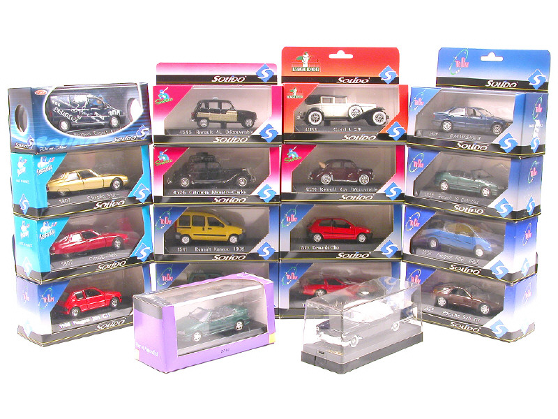 miniatures reproduisant les modèles : CADILLAC, CITROËN, PEUGEOT, RENAULT, CHEVROLET, CORD, FERRARI, BMW, PORSCHE & OPEL