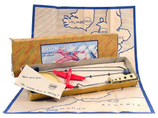 le coffret comprend l'avion en plastique (manque hélice), le socle, le flexible de guidage, une carte géographique JEP, la cale de fond de boîte & la notice