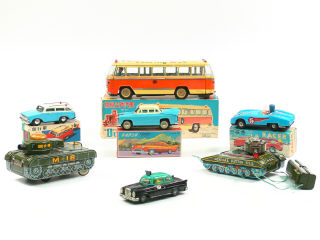 longueur 16 cm - moteur à friction (fonctionne) - avec bruiteur - manque un enjoliveur de roue - petites retouches d'usine - légères traces d'oxydation