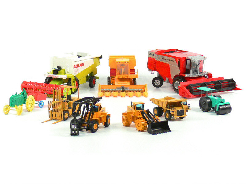 états de 'A' à 'D' - comprend 3 moissonneuses- batteuses, 4 tracteurs agricoles, un bulldozer, un rouleau-compresseur, un camion-benne de chantier, un chariot-élévateur, une chargeuse sur roues métalliques & un engin de levage de grumes - on y retrouve notamment les marques : SIKU, BRITAINS & JOAL - petits manques - 2 modèles sous sachets plastique jamais ouverts