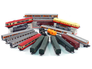 états de 'A' à 'F' - comprend : une locomotive à vapeur type 030, une motrice diesel de triage, un autorail, une Micheline, 12 voitures de voyageurs & 19 wagons de marchandises - on y retrouve les marques : JOUEF, FLEISCHMANN, MÄRKLIN, PIKO, LIMA & HORNBY - 3 wagons avec boîtes
