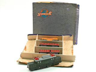 écartement 'O' - contient : une motrice électrique type 2B2 (en état 'D') avec pantographes incomplets & tordus, un wagon-fourgon, un wagon-tombereau & un wagon-citerne 'SHELL' - petites traces d'oxydation - coffret incomplet