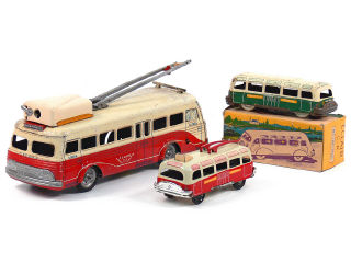 longueur 26 cm - moteur à clef (fonctionne) - avec éclairage de toit (manque ampoule), direction & conducteur - parties repeintes - traces d'oxydation