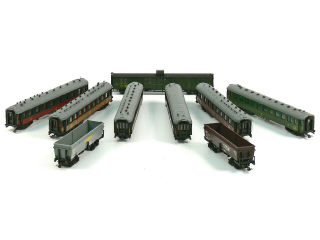 comprend : 6 voitures de voyageurs, un fourgon à bagages, 2 wagons-trémies ('STEMI' & 'SIMOTRA') - 2 modèles avec boîte - petits manques sur les toits de 2 voitures de voyageurs