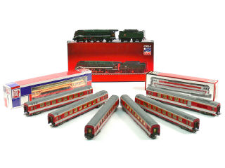 comprend : une locomotive à vapeur type 232.U.1 'SNCF' avec tender (boîte présente), une motrice électrique type CC40101 (avec boîte sous film plastique jamais déballé), un autorail panoramique (avec boîte sous film plastique jamais déballé) & 6 voitures de voyageurs - quelques attelages incomplets