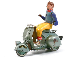 longueur 20 cm - moteur à clef (fonctionne) - avec personnage en tôle lithographiée (incomplet & retouché) & clef - manque pare-brise & roue de secours - traces d'oxydation