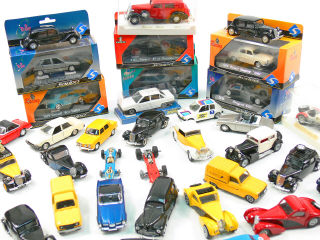 états de 'A' à 'D' - miniatures reproduisant les modèles : PEUGEOT, CITROËN, RENAULT, ALFA ROMEO, FACEL VEGA, ALPINE, FERRARI, VOISIN, HISPANO SUIZA, PACKARD, TALBOT, MERCEDES, DELAHAYE & BUGATTI - quelques véhicules incomplets & quelques autres avec détails de peinture & décalques ajoutés - 25 véhicules avec boîte