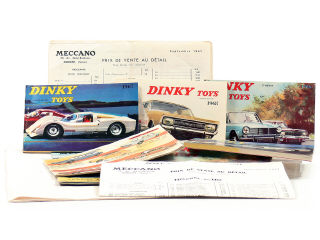 MECCANO, HORNBY & DINKY TOYS - une partie manquante sur la couverture - on y joint un catalogue de 1963 incomplet, un listing des DINKY TOYS de fabrication française de 1934 à 1961 diffusé par l'usine, une lettre d'anciens modèles encore disponibles & 4 feuilles de tarifs de 1959, 1960, 1961 & 1962