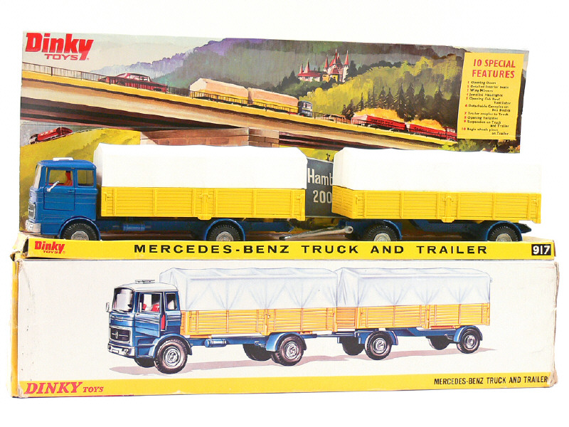 DINKY TOYS (GB) 917 MERCEDES Bâché avec remorque bâchée bleu foncé & jaune, bâches blanches
