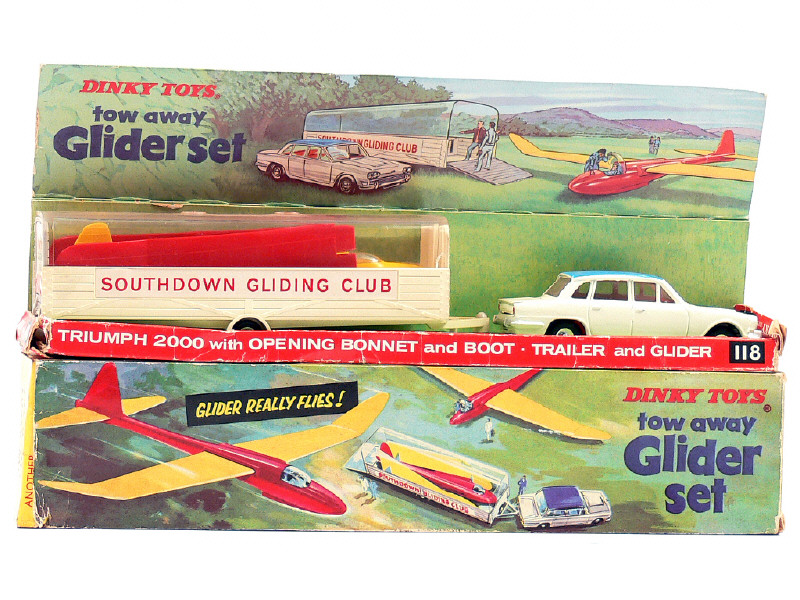 DINKY TOYS (GB) 118 TRIUMPH 2000 & Remorque avec planeur crème, toit bleu