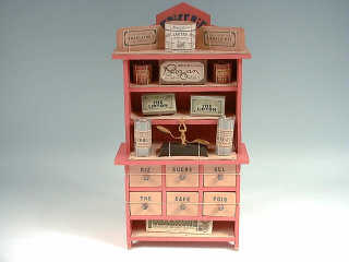 hauteur 40 cm - complète avec balance en tôle & tous les produits des grandes marques de l'époque - avec toutes les ficelles d'origine, jamais détachées - SUPERBE, EN ETAT EXCEPTIONNEL !