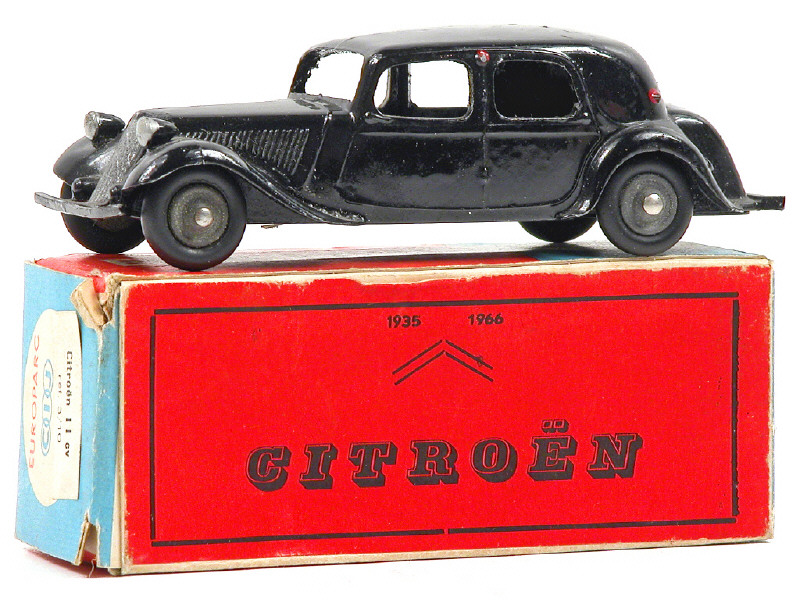 ex-modèle J.R.D. sorti en 1966 par C.I.J. après la fusion des 2 fabricants - papier collant 'CITROËN 1935-1966' sur 2 faces de la boîte (dont un incomplet) - étiquette 'CITROËN 11CV référence 3/10 sur un rabat de fermeture - pneus non d'origine - 2 extrémités de pare-chocs légèrement tordues
