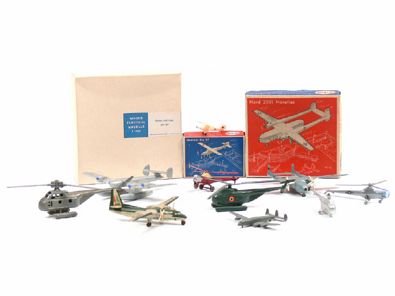 comprend notamment un BLOHM UND VOSS BV 139, un NORD 2501 NORATLAS, un DORNIER Do 27, un FOKKER F 27, un LOCKEED SUPER G CONSTELLATION, un SIKORSKY S 55 (3 exemplaires), un WESTLAND SIKORSKY - on y retrouve notamment les marques : WIKING, SIKU, MERCURY, DINKY TOYS & SOLIDO - 2 appareils en état 'C' dont un avec manques & un autre 'B' - 3 modèles avec boîte - un manque pale d'hélice sur un hélicoptère