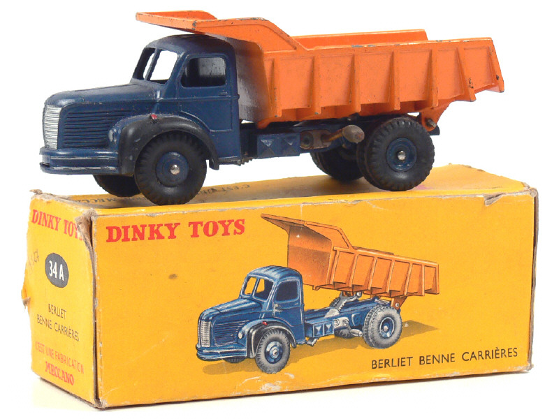 DINKY TOYS (FRANCE) 34A BERLIET Benne carrière MARREL (version avec jantes convexes) bleu foncé & orange
