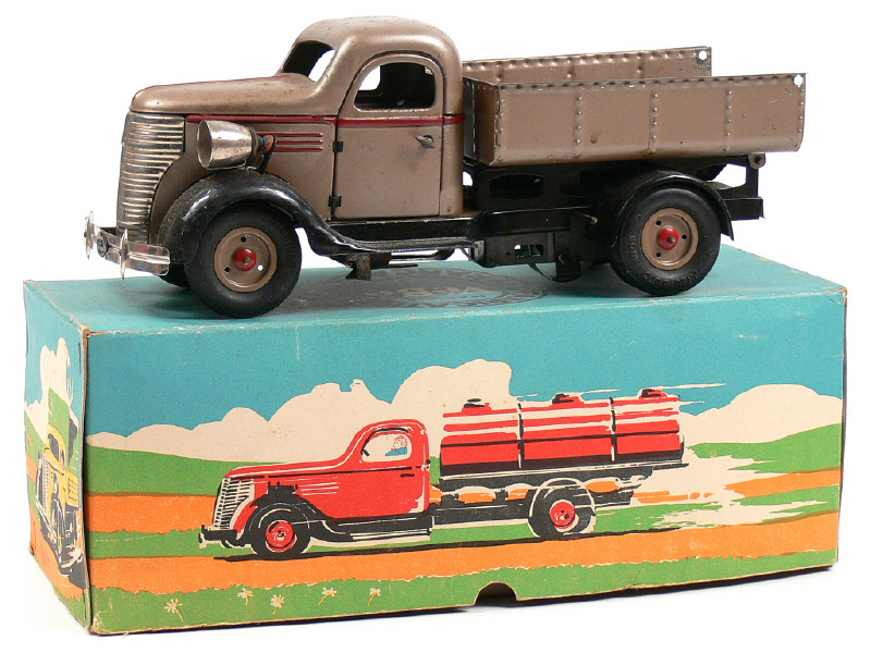 longueur 32 cm - moteur à clef (à revoir) - avec direction, porte ouvrante & phares électriques (fonctionnent) - manque cerclage de volant & ridelle arrière - petites traces d'oxydation