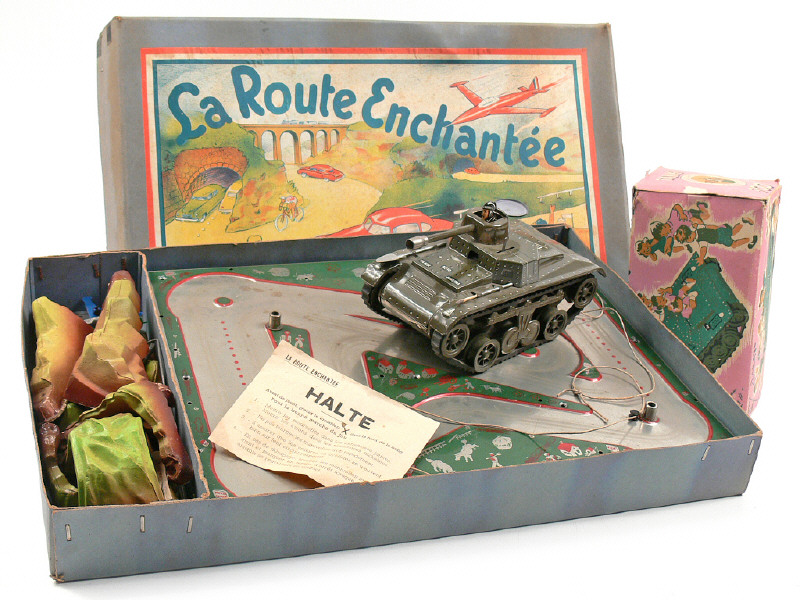 longueur 20 cm - moteur à clef (fonctionne poussivement) - en action, le char avance & projette des étincelles pendant que le conducteur sort & rentre de la tourelle - manque canon de mitrailleuse & un outil d'aile