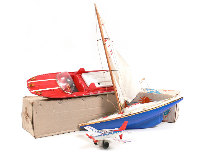 dimensions : 46 cm x 53 cm - coque en plastique - quelques cordages cassés - une petite annotation sur une voile