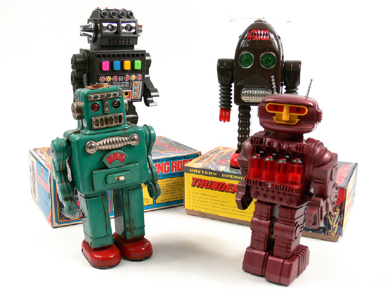 hauteur 29 cm - moteur à piles (fonctionne) - en action, le robot avance tandis que les pistons bougent - avec bruiteur - un mécanisme à revoir - manque 2 accessoires sur sa tête