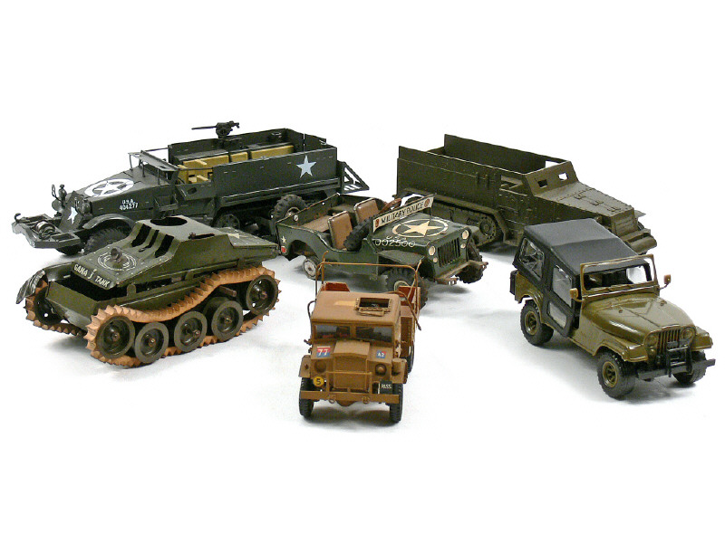 états de 'A' à 'F' - comprend : 2 HALF TRACK, une JEEP WILLYS, une JEEP CJ, un char & un camion - on y retrouve les marques : GONIO, IDEAL, ARNOLD, REVELL, MAX & GAMA