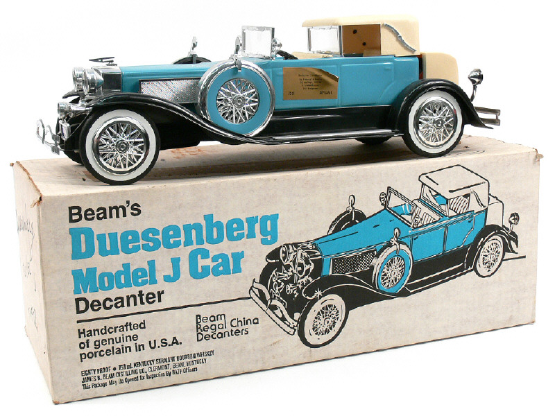 longueur 47 cm - carrosserie en porcelaine contenant 750 ml de Bourbon de la distillerie James B. BEAM (Kentucky) - avec étiquette de l'importateur pour le Bénélux collée sur la portière gauche & une languette en papier collée sur le bouchon (le bourbon est toujours présent) - boîte contenant cales, plastique de protection, 2 dépliants, cartons d'instruction & d'inscription au club des collectionneurs des bouteilles de la distillerie BEAM