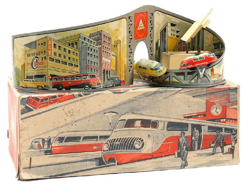 longueur 26 cm - moteur à ressort (fonctionne) - en action, un bras mécanique fait remonter chaque train qui revient à son point de départ - SUPERBE LITHOGRAPHIE !