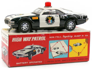 longueur 26,5 cm - moteur à piles (fonctionne) - en action, la voiture avance & change de direction quand elle arrive au bord de sa surface de roulement - avec gyrophare lumineux - ne fonctionne qu'en marche arrière