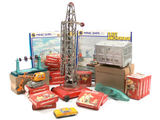 états de 'A' à 'D' - comprend une grue (avec manques), un sous-marin, 4 poulies sur chevalet (avec boîte), un taxi, une pelleteuse, 2 coffrets de quai maritime, un container sur roulettes (avec boîte) & un ensemble de 70 boîtes de pièces détachées de jeu 'PLASTICANT' avec 2 notices - on y retrouve notamment les marques : HAROLD FLORY, MINIC, FLEISCHMANN, K & MB