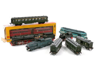 états de 'A' à 'B' - comprend : un autorail à 2 éléments 'DB' (avec boîte 'd'), une locomotive à vapeur type 231 'DB', une locomotive - tender type 120, une motrice électrique type BB 12040 'SNCF', une motrice diesel type 68001 'SNCF', 3 voitures de voyageurs & un wagon-fourgon (manque portes coulissantes) - traces d'oxydation sur 2 voitures & le fourgon