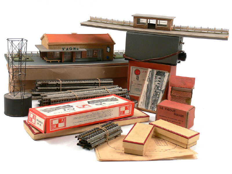 comprend : des rails, 3 transformateurs, des heurtoirs, des signaux de voie, un quai, une gare & une boîte de personnages - on y retrouve notamment les marques : V.B., LE DISQUE ROUGE & JOUEF