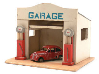 dimensions : 25 x 22,5 x 20 cm - réalisation en bois - porte incomplète - on y joint une renault JUVAQUATRE en état 'D' (pneus manquants) de la marque CIJ