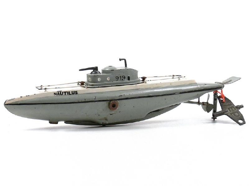 ce modèle de 42 cm est inspiré du célèbre NAUTILUS américain, animé par un moteur à ressort puissant - moteur à friction (à revoir) - avec clef - sa particularité est de pouvoir plonger & naviguer sous le niveau de l'eau