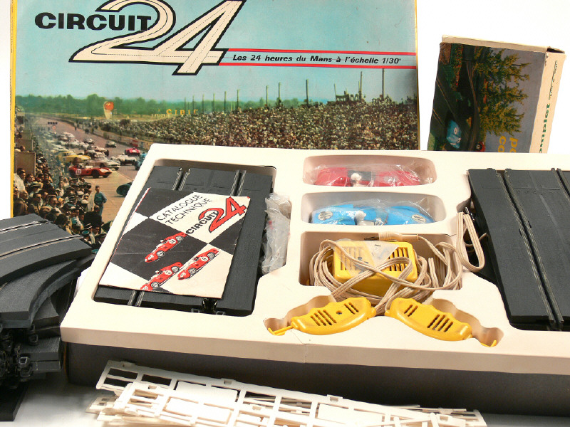 dimensions du coffret : 56 x 38 cm - contient : une FERRARI, une DB PANHARD (traces de ruban adhésif sur le châssis), 8 rails droits (dont 2 dos d'âne), 4 rails courbes, un transformateur, 2 poignées, une notice & accessoires - manque quelques numéros de compétition - on y joint un pont avec sa boîte, quelques barrières, des rails courbes & droits