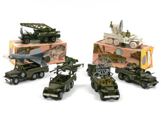 comprend : un lance-fusée, un porte-radar, un double-canon antiaérien, une grue, un porte-projecteur & un transport de troupes (modèle modifié avec soldats non d'origine) - 2 camions avec boîte (état 'd') & un autre de la marque CHAMPION (moule FRANCE JOUETS)