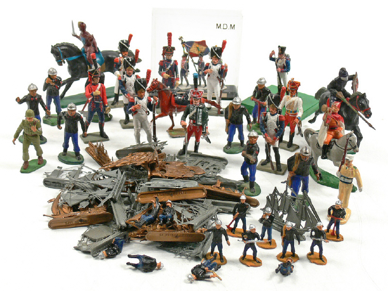 états de 'A' à 'C' - comprend : 21 pompiers, 14 soldats de l'époque napoléonienne, 2 chevaliers, un légionnaire (repeint), un spahis & un infirmier - 4 figurines en boîte - une baïonnette recollée - un cheval transformé - 2 petits manques - on y retrouve notamment les marques : STARLUX, MDM & JIM - on y joint 34 navires de la marque MOKAREX
