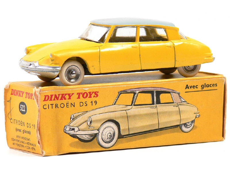 DINKY TOYS (FRANCE) 522 CITROËN DS 19 (version avec vitres & jantes concaves) jaune d'or, toit gris clair