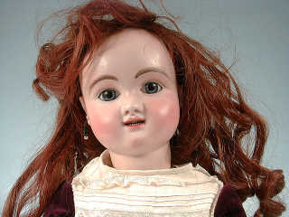 (restaurée) marquée en creux : " Figure B n° 5 J. Steiner Bté SGDG Paris ", yeux fixes bleus en sulfure, bouche ouverte sur deux rangées de dents (dents de requin), corps en composition articulé à poignets fixes (une main restaurée), perruque auburn, cheveux naturels, sous-vêtements, robe en velours violet, corsage blanc, volant de tulle brodé et Valenciennes, chaussures blanches en peau et chaussettes beige. H : 64 cm