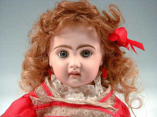 (fêle au front), tampon rouge " Déposé Tête Jumeau " T.5, yeux fixes bleus en verre, bouche ouverte sur une rangée de dents, oreilles percées, corps en composition articulé, perruque blonde, cheveux naturels, sous-vêtements, robe soie rouge et Valenciennes, chaussures noires en cuir. H : 41 cm