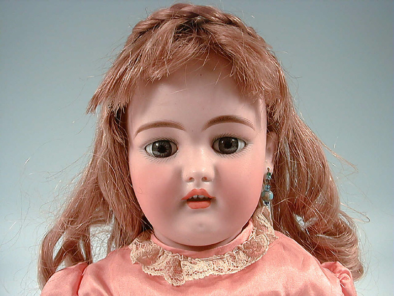 tête en biscuit marquée en creux " S & H.1079.DEP Germany " T.8, yeux fixes gris, bouche ouverte sur une rangée de dents, oreilles percées, corps en composition articulé marqué au tampon bleu " Paris Bébé Déposé ", perruque blonde, cheveux naturels, robe en soie rose à volants de tulle brodé, chaussures noires et chaussettes blanches. H : 49 cm