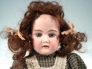 tête fixe et collerette en biscuit, accident et restauration au cou, marquée en creux " Florodora A 1 M ", étoile en creux au front, yeux fixes bleus, bouche ouverte sur une rangée de dents, corps en peau, articulations aux hanches, restaurations aux bras et aux jambes, perruque brune, cheveux naturels, robe noire à carreaux beige. H : 53 cm