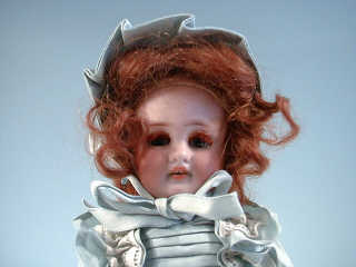 marquée en creux " DEP ", yeux bleus mobiles, bouche ouverte sur une rangée de dents, oreilles percées, corps en composition articulé, perruque auburn en mohair, chemise de jour, robe en soie bleue et coiffe assortie, chaussures et chaussettes blanches. H : 26 cm