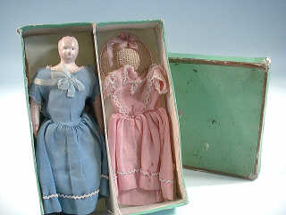 tête et collerette en composition, traits et cheveux peints, corps raide en peau, robe bleue, coiffe dans l'état, chaussures noires, dans sa boîte avec une robe rose et un chapeau de paille. H : 20 cm